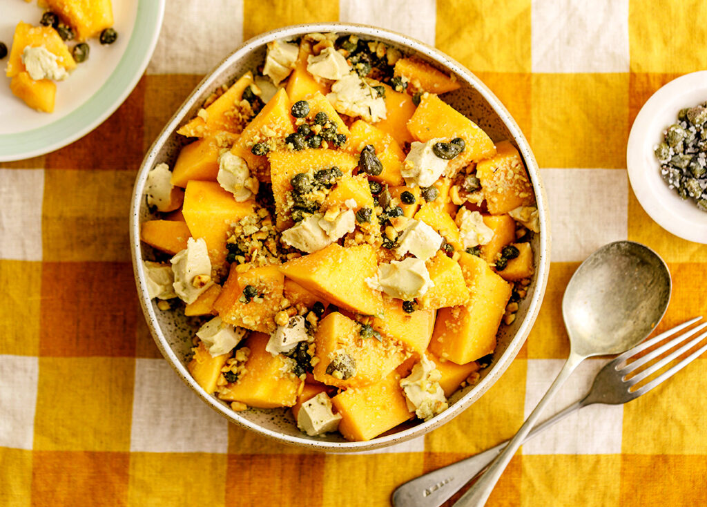 This salad’s breaking all the rules – there’s not a leaf in sight. And honestly – who needs ‘em?! Instead, we’ve got sweet, soft rockmelon, salty bites of capers, rich pieces of roasted hazelnut, and tangy pops of plant-based feta. An unexpectedly harmonious medley.