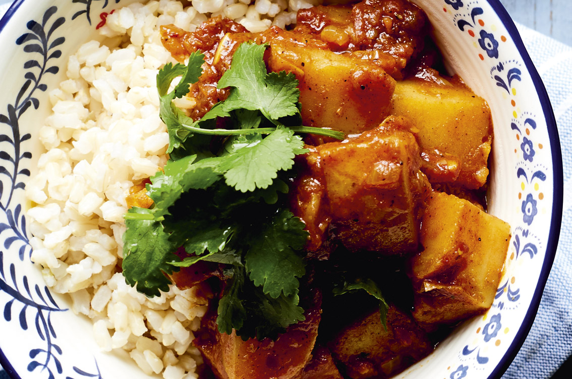 Pour in 1 cup water and stir until well mixed in; if the potatoes aren’t covered in liquid, add a little more water. Bring to the boil, then reduce the heat to very low. Put the lid on and simmer for 10–15 minutes, or until the potatoes are tender, stirring often to ensure the mixture doesn’t stick to the bottom of the pan.