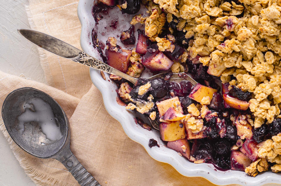 Serve the crumble with vegan ice cream or a dollop of thick, vanilla bean coconut yoghurt.