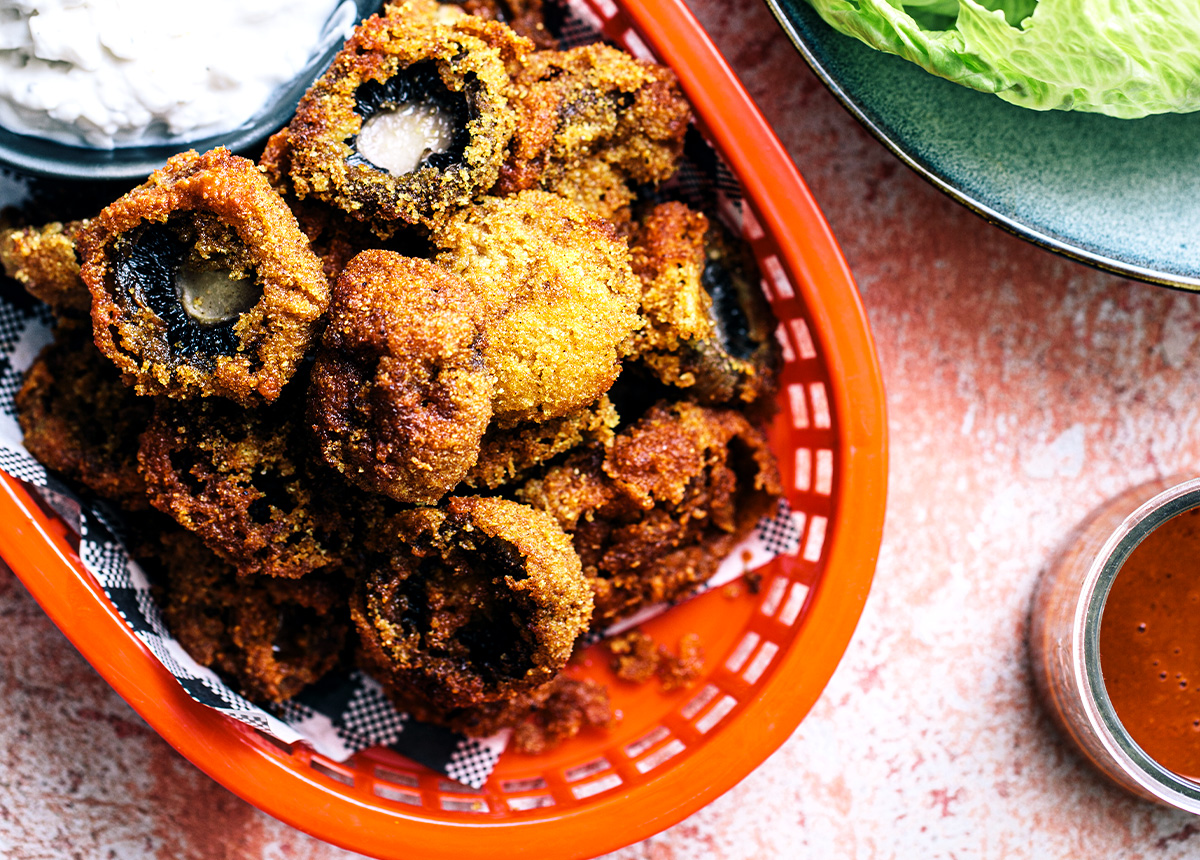 There are few things that don’t work deep-fried, slathered in buffalo sauce, and dunked in a vegan blue cheese dip. But these mushrooms are especially delightful, perfectly bite-sized and tender in the middle!