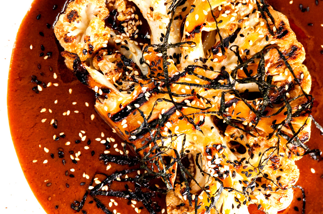 As if we needed another reason to love our dear cauliflower — with this slow-grill method and richly salty-sweet sauce, the veggie is transformed into a strikingly ‘meaty’ centrepiece.