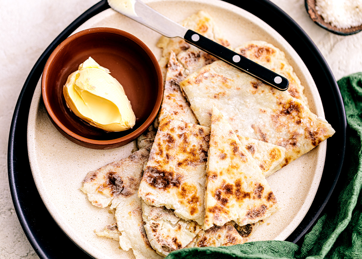 Using a cast iron pan, preheat on the stove on medium heat. Place your dough in the dry pan, and cook on both sides until golden. Each side should take around 2 minutes.