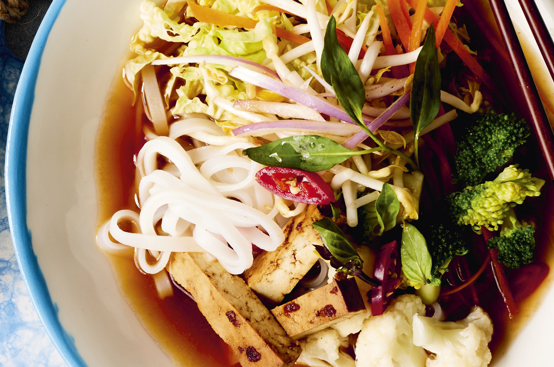 Bring the hot stockpot to the table and place on a wooden board. Divide the noodles evenly between four large, warmed bowls and allow people to add their chosen veggies before ladling in the piping-hot stock. Invite everyone to garnish and season their own bowls as desired.